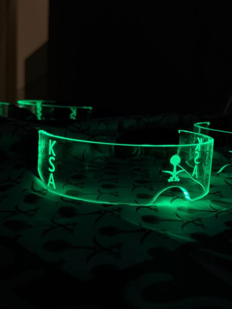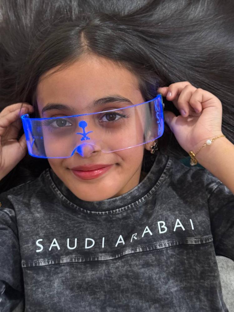 تصميم النظارة يتضمن تفاصيل فنية مثل الشعار الوطني وكتابة “KSA”، مما يعزز من شعور الفخر والاحتفال بالهوية الوطنية.